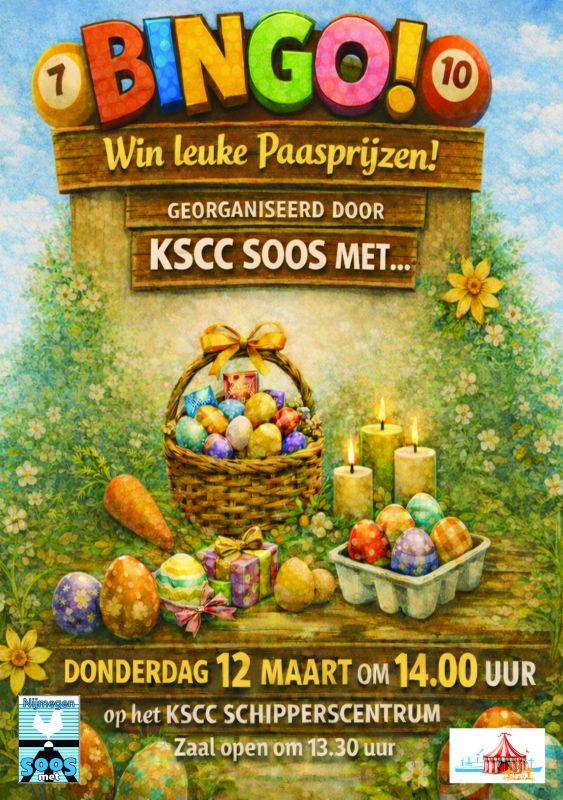 Goed nieuws: de KSCC Soos met… van donderdag 12 maart gaat gewoon door! Deze middag organiseren we een gezellige bingomiddag waarbij je leuke en aantrekkelijke paasartikelen kunt winnen.